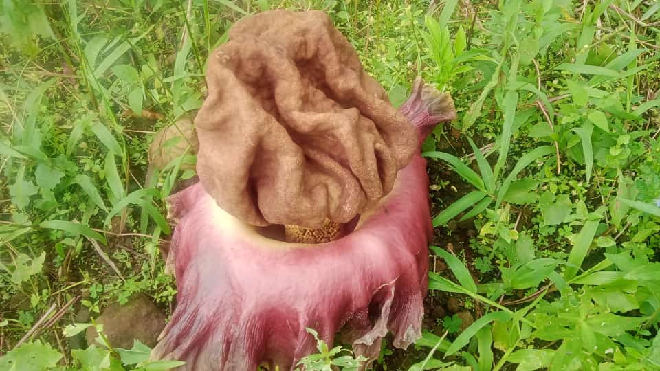Informasi yang dihimpun Tahu Ekspres, Bunga Bangkai jenis Amorphopphallus Paeoniifolius tersebut diperkirakan sudah tumbuh satu minggu dan kondisinya sekarang sudah mulai layu.
