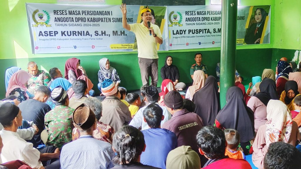 Sumedang – Anggota DPRD Sumedang dari Fraksi Partai Golkar, Asep Kurnia, turun langsung mendengarkan aspirasi masyarakat hingga ke daerah perbatasan Sumedang-Bandung dalam agenda reses masa persidangan 1 tahun sidang 2024-2025. Reses ini digelar di Masjid Jami Al-Hikmah, Kampung Lewiliang, Desa Sindulang, Kecamatan Cimanggung, Minggu (10/11/2024).