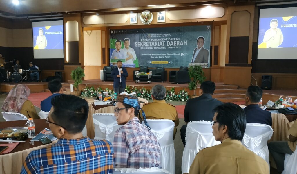 TAHUEKSPRES, SUMEDANG – Wakil Bupati (Wabup) Sumedang, H. Erwan Setiawan membuka kegiatan Forum Perangkat Daerah dalam rangka penyusunan Rencana Kerja Perangkat Daerah (RKPD) Tahun 2024 pada Sekretariat Daerah (Setda) di Aula Tampomas Pusat Pemerintahan Sumedang (PPS), Jawa Barat (Jabar), Senin (6/3/2023).