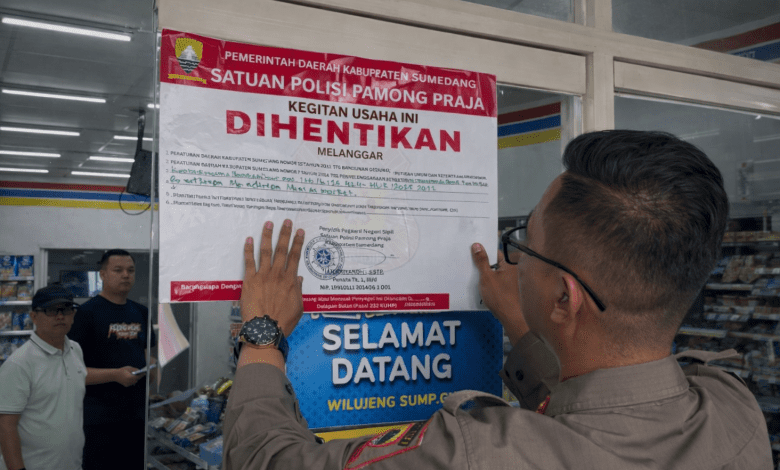 Sumedang — Satuan Polisi Pamong Praja (Satpol PP) Kabupaten Sumedang menghentikan sementara pemanfaatan bangunan gedung sebuah minimarket di Desa Cikareo Selatan, Kecamatan Wado, Jum’at (6/2/2026). Langkah itu dilakukan karena bangunan usaha tersebut dinilai belum memenuhi persyaratan administratif dan teknis bangunan gedung.