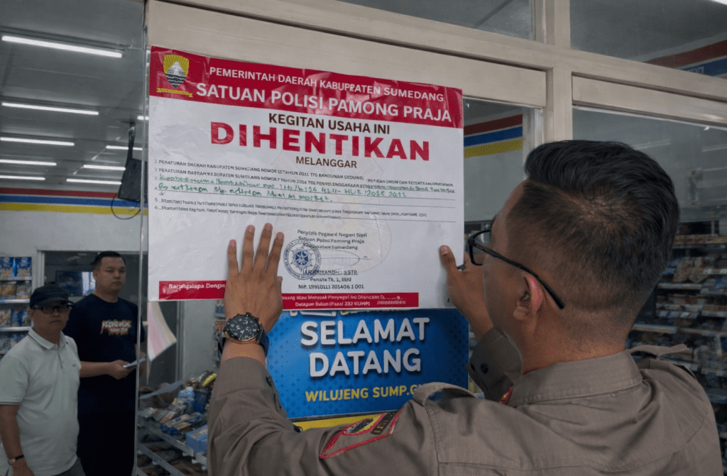 Sumedang — Satuan Polisi Pamong Praja (Satpol PP) Kabupaten Sumedang menghentikan sementara pemanfaatan bangunan gedung sebuah minimarket di Desa Cikareo Selatan, Kecamatan Wado, Jum’at (6/2/2026). Langkah itu dilakukan karena bangunan usaha tersebut dinilai belum memenuhi persyaratan administratif dan teknis bangunan gedung.
