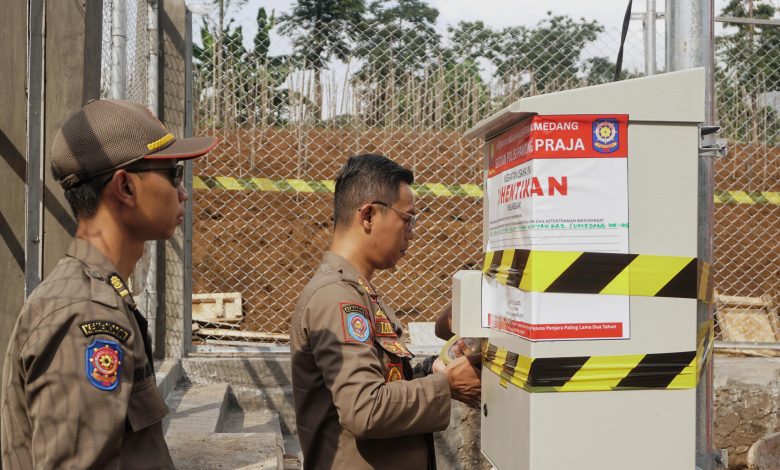 Sumedang – Satuan Polisi Pamong Praja (Satpol PP) Kabupaten Sumedang melakukan penegakan Peraturan Daerah (Perda) dengan menyegel sementara pembangunan menara (tower) telekomunikasi di Desa Sukawangi, Kecamatan Pamulihan. Tindakan tersebut dilakukan karena pembangunan belum mengantongi Persetujuan Bangunan Gedung (PBG).