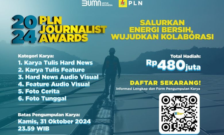 TAHUEKSPRES, JAKARTA – PT PLN (Persero) menyiapkan total hadiah sebesar Rp480 juta bagi para pemenang PLN Journalist Award (PJA) 2024 yang mengusung tema, Salurkan Energi Bersih, Wujudkan Kolaborasi. Periode pendaftaran PJA 2024 masih dibuka hingga 31 Oktober 2024.