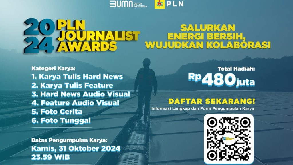 TAHUEKSPRES, JAKARTA – PT PLN (Persero) menyiapkan total hadiah sebesar Rp480 juta bagi para pemenang PLN Journalist Award (PJA) 2024 yang mengusung tema, Salurkan Energi Bersih, Wujudkan Kolaborasi. Periode pendaftaran PJA 2024 masih dibuka hingga 31 Oktober 2024.
