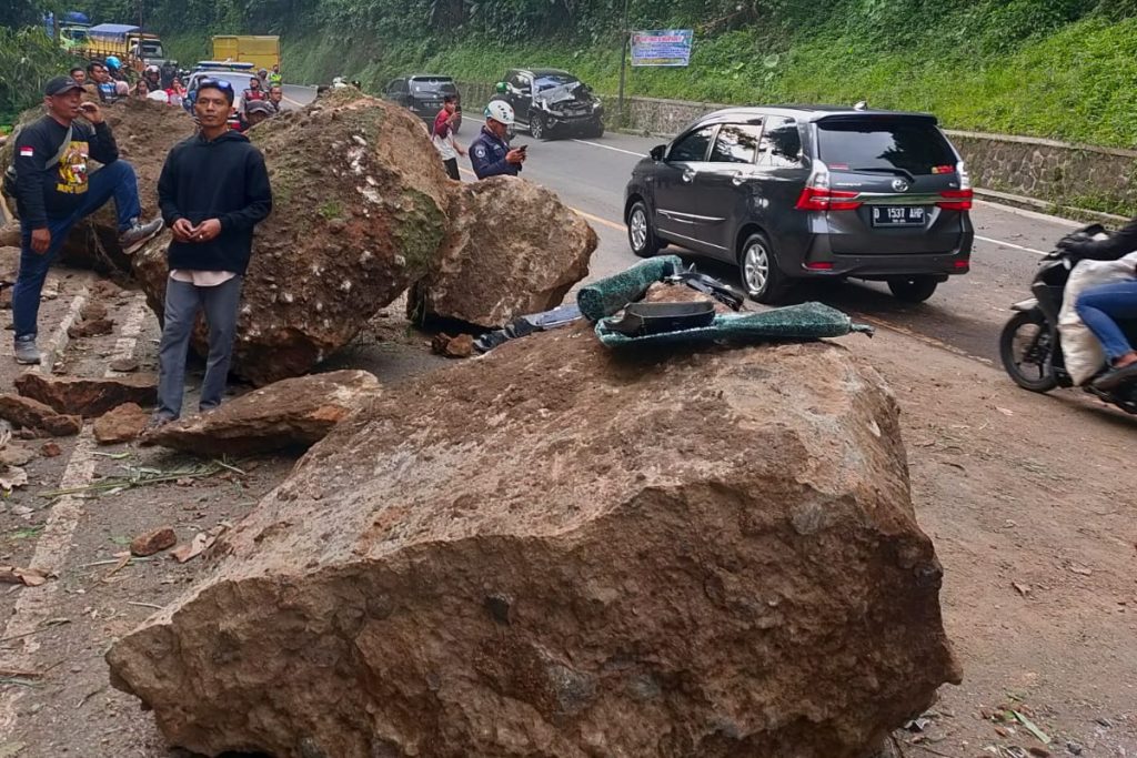 Longsor batu besar yang terjadi di Jalan Cadas Pangeran Sumedang menghantam 2 mobil yang sedang melintas, sekira Jam 15.00 WIB, Sabtu (29/10)