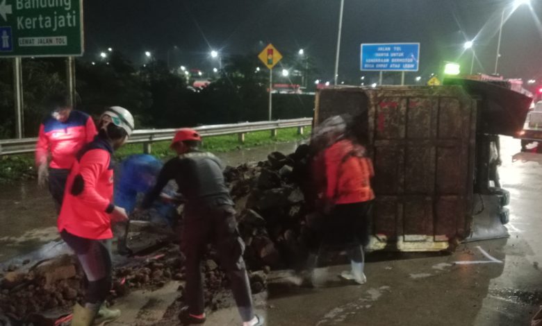 Berdasarkan pantauan Tahu Ekspres di lapangan, petugas kepolisian bersama unsur BPBD Kabupaten Sumedang masih melakukan pembersihan material batu yang diangkut truk yang terlibat kecelakaan.