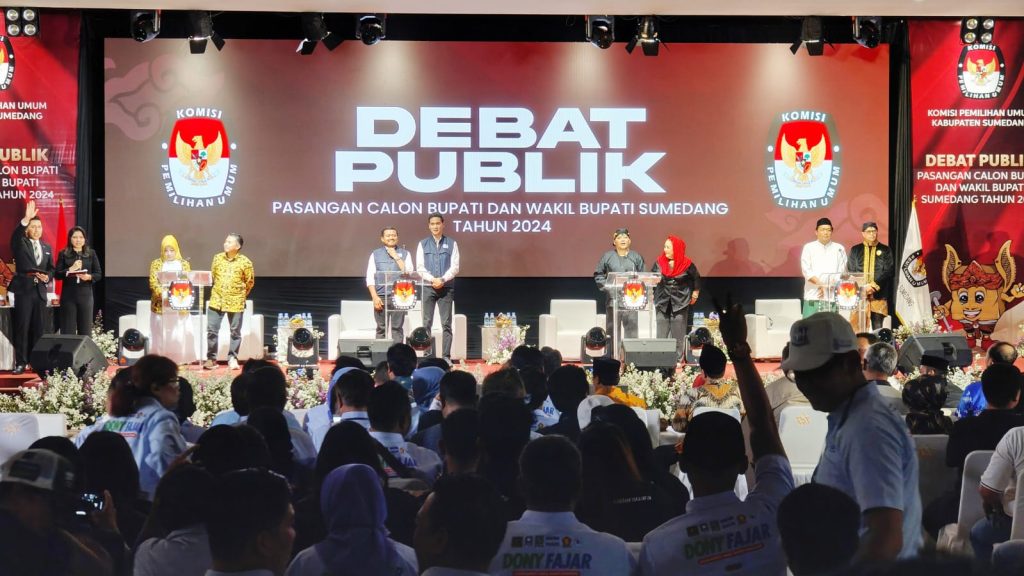 Sumedang – Debat publik pasangan calon Bupati dan Wakil Bupati Sumedang tahun 2024 berlangsung di Graha Plaza Asia Sumedang pada Sabtu (2/11/2024). Empat pasangan calon (Paslon) memaparkan visi dan misi mereka dalam acara yang disiarkan langsung melalui TVRI, SMTV, dan kanal YouTube KPU Sumedang. Momen ini menjadi ajang bagi masyarakat untuk mengenal lebih dalam rencana-rencana yang ditawarkan para calon pemimpin Sumedang.