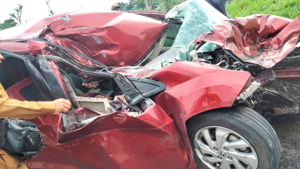 Mobil berwarna merah yang terlibat kecelakaan di dekat terowongan kembar Jalan Tol Cisumdawu KM 160 Kecamatan Pamulihan Kabupaten Sumedang, mengalami kerusakan yang sangat parah. Terutama di bagian mobil depan tampak ringsek dan penyok sampai ke bagian atas supir.