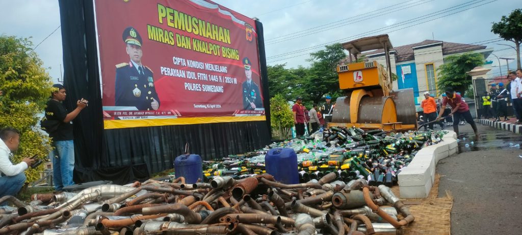 TAHUEKSPRES, SUMEDANG – Jelang hari raya Idul Fitri 1445 H, sebanyak 4621 botol minuman keras (miras) dari berbagai merk dan 603 knalpot bising dimusnahkan dengan cara dilindas oleh stum di Mapolres Sumedang Jawa Barat (Jabar), Rabu (3/4/2024).