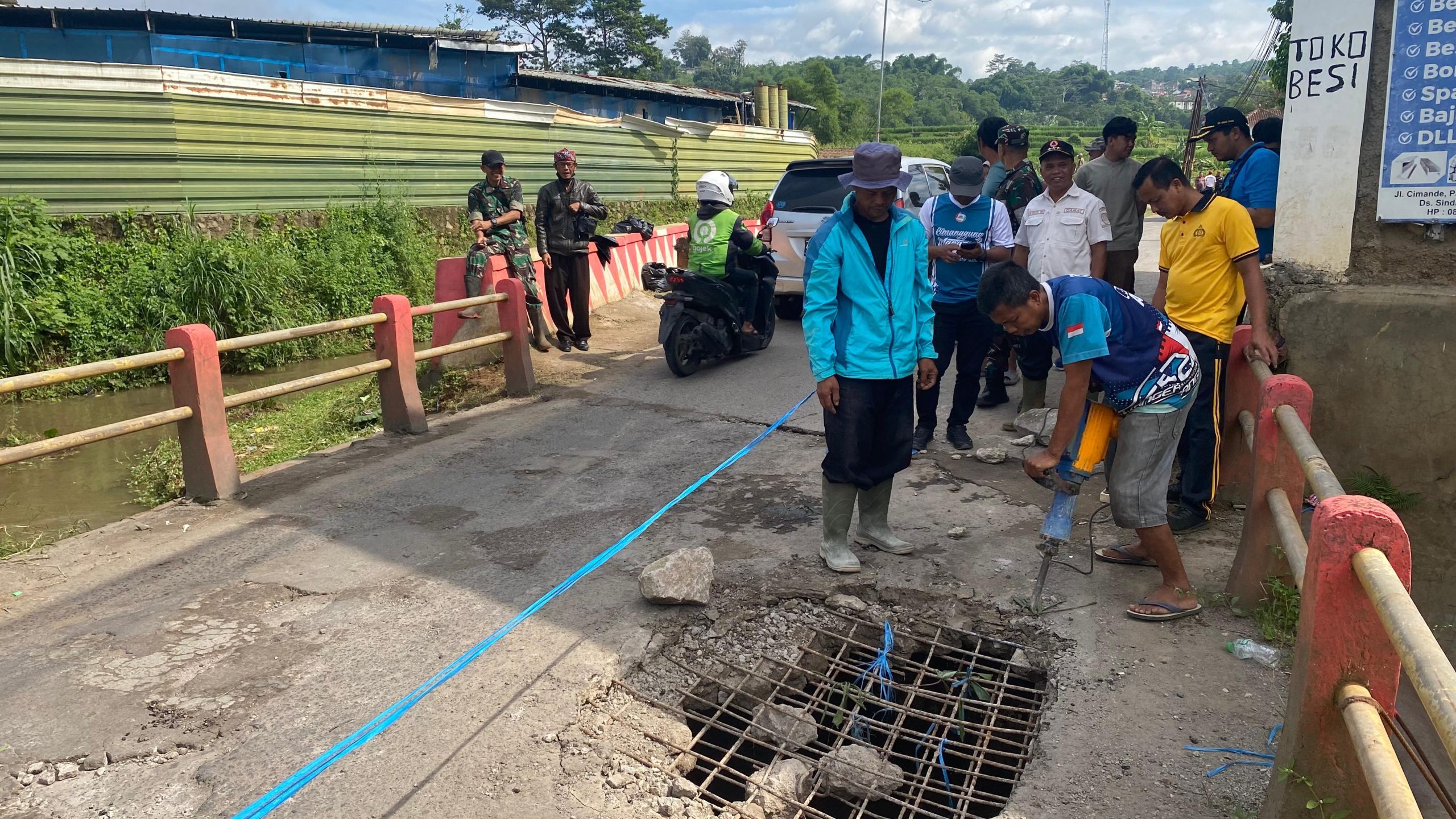 CIMANGGUNG, SUMEDANG — Forkopimcam Cimanggung bersama warga masyarakat menggelar kegiatan Jumat Bersih sekaligus melakukan penanganan sementara jembatan berlubang di Jalan Mayor Mansur, Dusun Cimande RT 1 RW 11, Desa Sindangpakuon, Kecamatan Cimanggung, Kabupaten Sumedang, Jumat (6/2/2026).