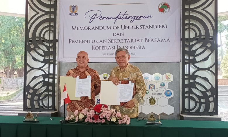 TAHUEKSPRES, SUMEDANG – Rektor Institut Koperasi Indonesia (IKOPIN) University, Prof. Dr. Ir. Agus Pakpahan melakukan penandatangan Memorandum of Understanding (MoU) dengan sejumlah Koperasi sekaligus membentuk Sekretariat Bersama (Sekber) Koperasi Indonesia di Kampus IKOPIN University Jatinangor Sumedang Jawa Barat (Jabar), Selasa (17/10/2023).