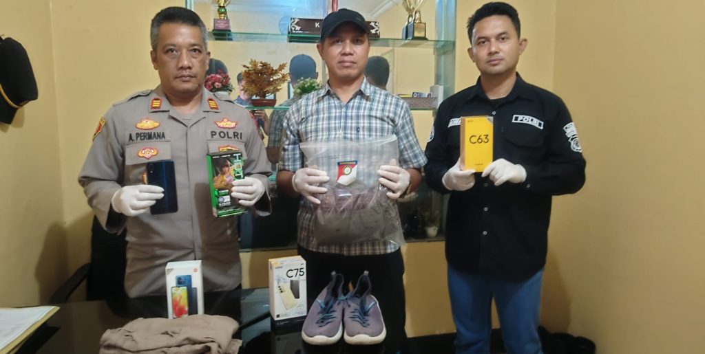 Adapun barang bukti yang diamankan handphone sejumlah 6 (enam) unit dengan kondisi masih dalam kardus 4 unit dan 2 kondisi perlu diservis. Kemudian baju, sepatu dan celana yang digunakan pelaku saat menjalankan aksinya.