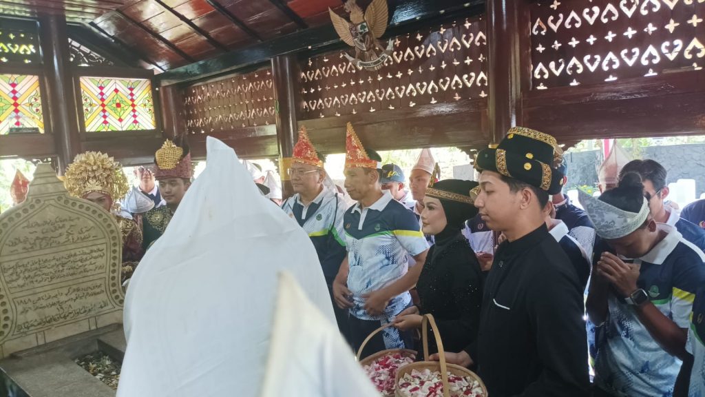 Irjen Pol Akhmad Wiyagus dan Ketua KONI Jabar M Budiana berikut sejumlah atlet PON saat berziarah di Makam Tjut Nyak Dhien Sumedang Jabar, Selasa (20/8/2024). (FOTO: Alan Dahlan)