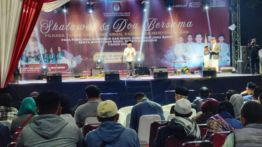 Sumedang – Komisi Pemilihan Umum (KPU) Kabupaten Sumedang menggelar kegiatan Shalawat dan Doa Bersama di Alun-Alun Sumedang pada Senin (25/11/2024) malam. Acara ini bertujuan menciptakan suasana Pilkada 2024 yang aman, damai, dan menyenangkan.