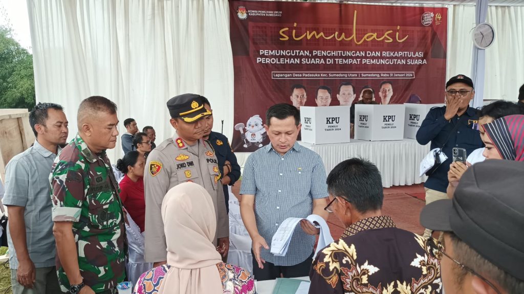 TAHUEKSPRES, SUMEDANG – 14 hari menuju Pemilu 2024, Komisi Pemilihan Umum (KPU) Kabupaten Sumedang Simulasikan Tatacara Pemungutan, Penghitungan dan Proses Rekapitulasi Perolehan Suara di Tempat Pemungutan Suara (TPS) Lapangan Desa Padasuka Sumedang Utara Jawa Barat (Jabar), Rabu (31/1/2024).