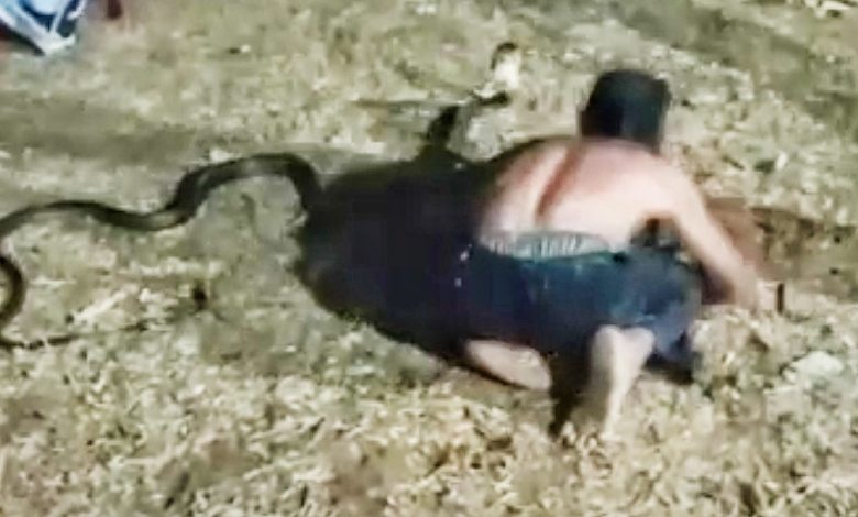 Dalam posisi itulah, Bah Kobra sempat menoleh ke ular warna hijau yang sedang dipegang oleh tangan kanannya. Namun secara tiba-tiba, ular King Kobra yang berada di depan sebelah kiri tiba-tiba mematuk tangan kiri bagian bawah setelah sikut. Bah Kobra pun sontak segera berdiri dan berusaha mengayun-ngayunkan tangan kirinya untuk melepaskan gigitan ular King Kobra.