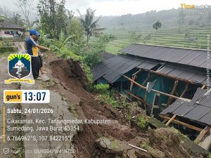 Sumedang – Longsor terjadi di Dusun Kebon Manggu, Desa Cikaramas, Kecamatan Tanjungmedar, Sumedang, Sabtu (24/1/2026) pukul 03.00 WIB. Longsor tersebut menyebabkan gudang pupuk milik kelompok tani ambruk dan satu rumah terancam longsor.