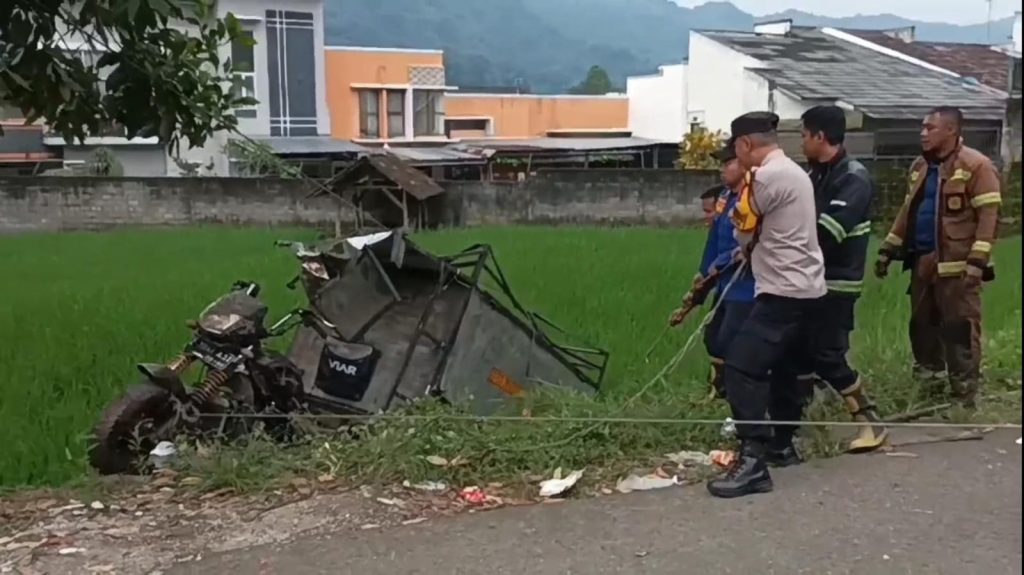 umedang – Sebuah motor roda tiga terperosok ke area persawahan di Jalan Gunung Puyuh, Kawasan Sukajaya, Kecamatan Sumedang Selatan, Kabupaten Sumedang, Jawa Barat, Kamis (5/2/2026).