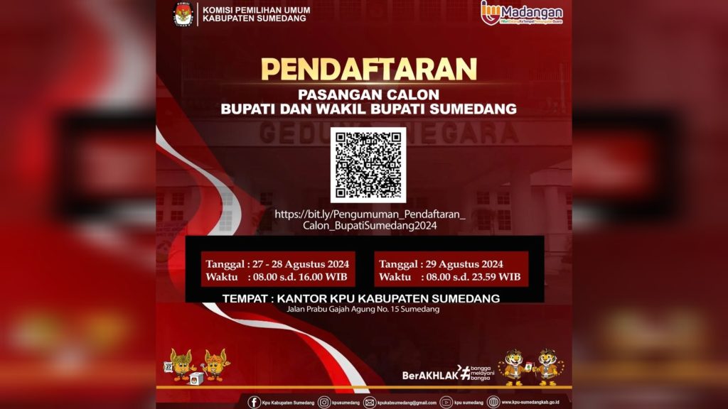 Komisi Pemilihan Umum (KPU) Kabupaten Sumedang telah secara resmi mengumumkan pembukaan Pendaftaran Pasangan Calon Bupati dan Wakil Bupati Sumedang Tahun 2024 melalui surat pengumuman Nomor 18/PL.02.2-Pu/3211/2024 tertanggal 24 Agustus 2024 yang ditandatangani langsung oleh Ketua KPU Sumedang, Ogi Ahmad Fauzi.