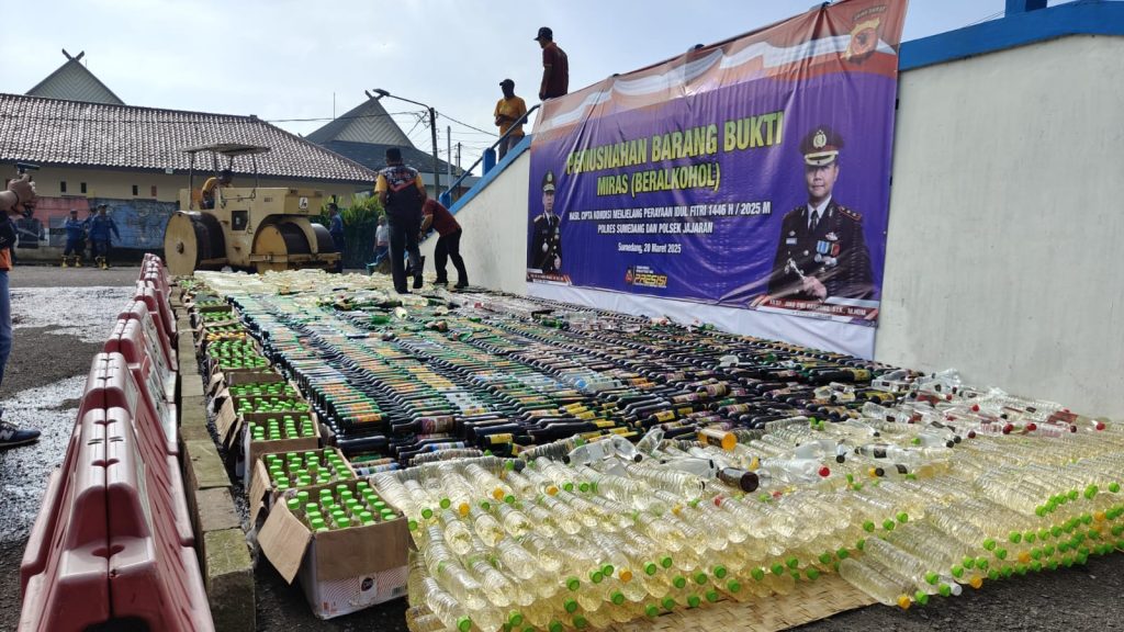 Sumedang – Polres Sumedang memusnahkan 10.964 botol minuman keras (miras) dan 20 liter tuak hasil operasi cipta kondisi menjelang Idulfitri 1446 H/2025 M. Pemusnahan berlangsung di Mako Polres Sumedang, Kamis (20/3), disaksikan oleh unsur Forkopimda, tokoh masyarakat, tokoh agama, LSM, dan wartawan.
