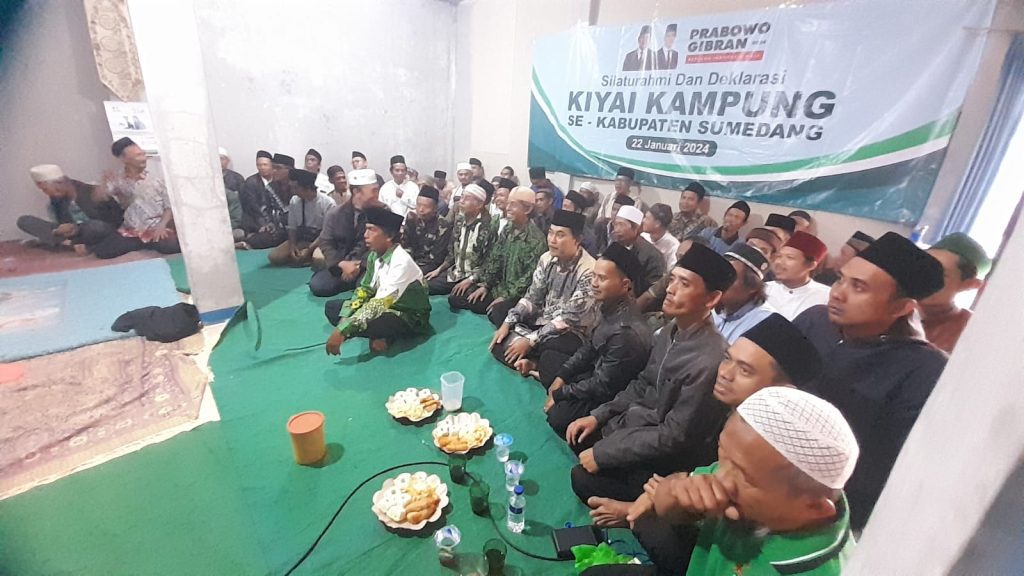 Sebanyak 71 kiai kampung dari berbagai wilayah di Kabupaten Sumedang yang tergabung dalam Majelis Silaturahmi Ulama Rakyat (Masura) pimpinan Ustad Muhamad Samsudin mendeklarasikan diri mendukung pasangan Calon Presiden Prabowo Subianto dan Wakil Presiden Gibran Rakabuming Raka di salah satu rumah kiai di Kelurahan Kota Kulon, Kecamatan Sumedang Selatan, Kabupaten Sumedang, Senin (22/1/2024).