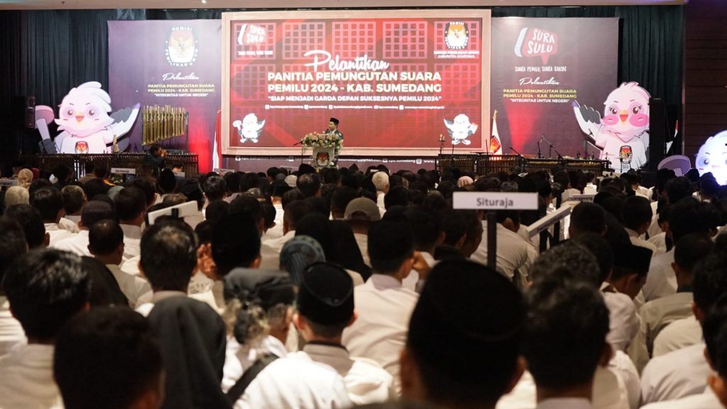 TAHUEKSPRES, SUMEDANG – Sebanyak 831 orang Panitia Pemungutan Suara (PPS) dari 26 Kecamatan se-Kabupaten Sumedang resmi dilantik sebagai panitia penyelenggara Pemilihan Umum (Pemilu) 2024 yang disaksikan langsung oleh pejabat Forum Koordinasi Pimpinan Daerah (Forkopimda) dari mulai Bupati Sumedang, Dony Ahmad Munir, Kapolres AKBP Indra Setiawan hingga Dandim 0610 Letkol Infanteri Hendrix Fahlevi Rangkuti di Graha Asia Plaza Sumedang Jawa Barat (Jabar), Selasa (24/1/2023).