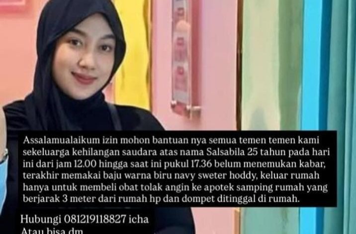 Berdasarkan keterangan keluarga, Salsabila Handini Putri diketahui meninggalkan rumah pada Rabu, 28 Januari 2026 sekitar pukul 12.00 WIB dalam kondisi sehat jasmani dan rohani.