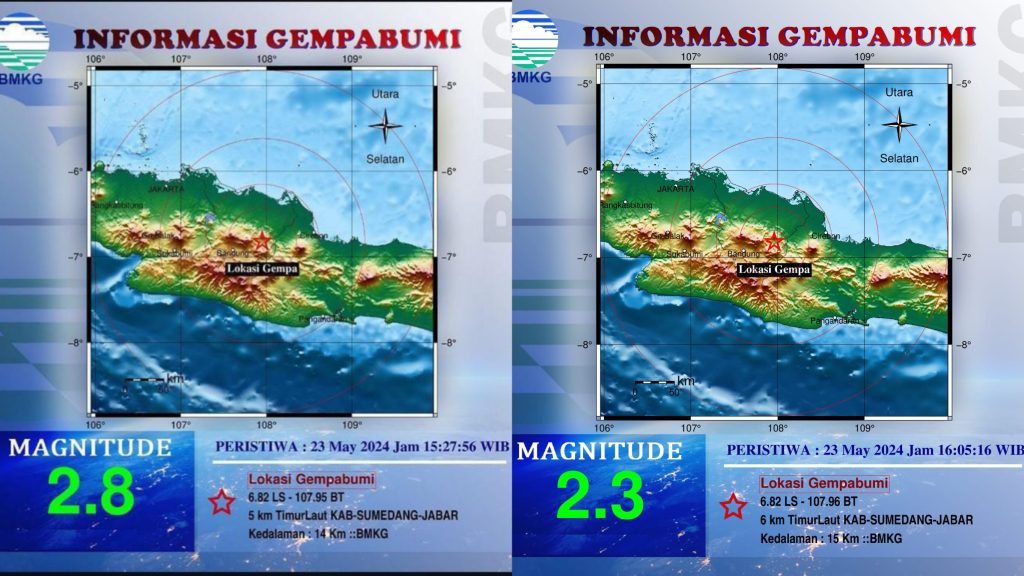 Hari ini, Kamis, 23 Mei 2024, Kabupaten Sumedang kembali diguncang gempa susulan pada Jam 15.27 WIB dengan kekuatan Magnitudo 2,8 (kedalaman 14 Km) dan pada Jam 16.05 WIB dengan kekuatan M 2,3 (kedalaman 15 Km).