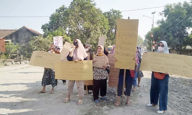 Emak-emak ini kesal karena kondisi jalan yang rusak parah mengeluarkan debu yang mengotori rumah-rumah mereka yang berada di pinggir jalan tersebut.