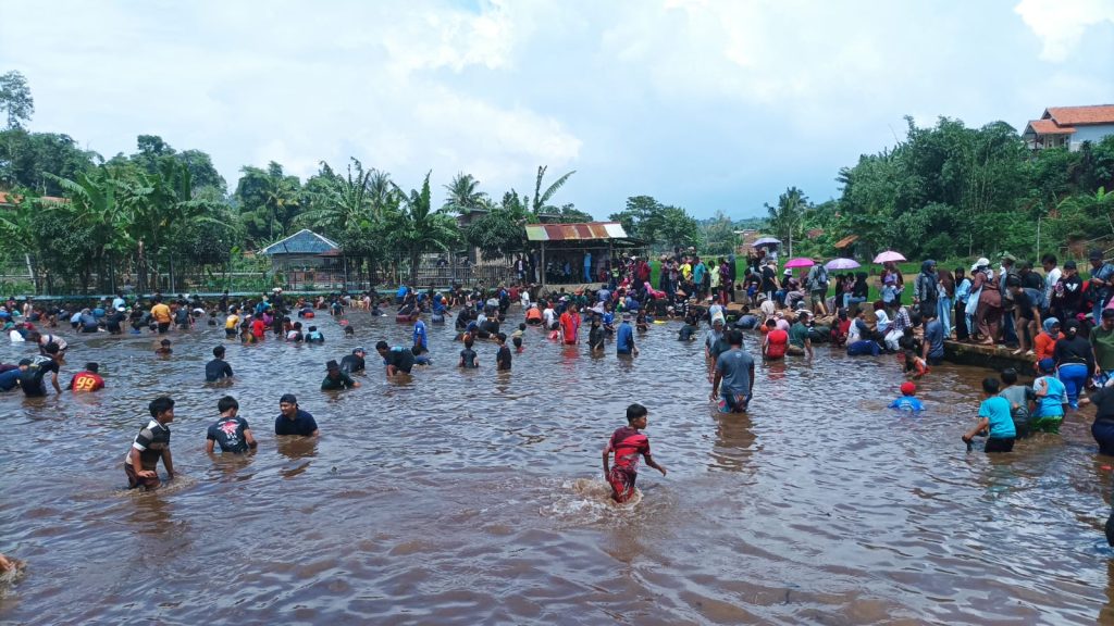 TAHUEKSPRES, SUMEDANG – Ratusan warga Ciluluk Tanjungsari Sumedang Jawa Barat (Jabar) tumpah ruah di kolam ikan milik Bos Persib Bandung, H. Umuh Muchtar untuk menangkap ikan dengan kedua tangan atau ‘Ngagogo‘ dalam bahasa sunda yang dimulai sejak pukul 13.00 WIB hingga 15.30 WIB, Minggu (18/2/2024).